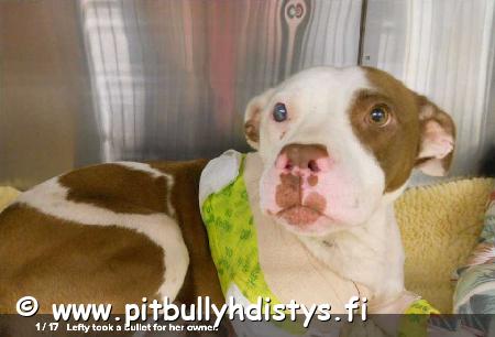 1. LEFTY-pitbulli otti osumaa pelastaen omistajansa. Kotimurtovaras ampui haulikolla, Lefty hyppäsi haulisuihkun eteen pelastaen omstajansa. Sankari-pitbulli selvisi vammoista vaikka menetti yhden jalkansa. Lefty pärjää kuulemma kolmijalkaisena kuin olisi aina ollut sellainen!