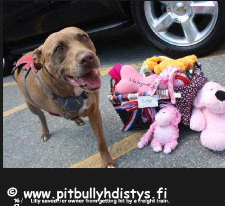 16. Amerikanpitbullterrieri LILLY pelasti omistajansa junaturmassa. Eräänä myöhäisenä iltana Lilly-pitbulli ja sen omistaja Shirley olivat kävelyllä joka ristesi ratapihan yli. Shirley kompastui, löi päänsä ja jäi makaamaan raiteille. Lilly-pitbulli havaitsi lähestyvän junan ja retuutti tiedottoman omistajan pois raiteilta, jääden itse törmäyskurssille. Tapahtumalla on silminnäkijä, rahtijunan kuljettaja, joka ei kuitenkaan onnistunut pysäyttämään junaa ajoissa.