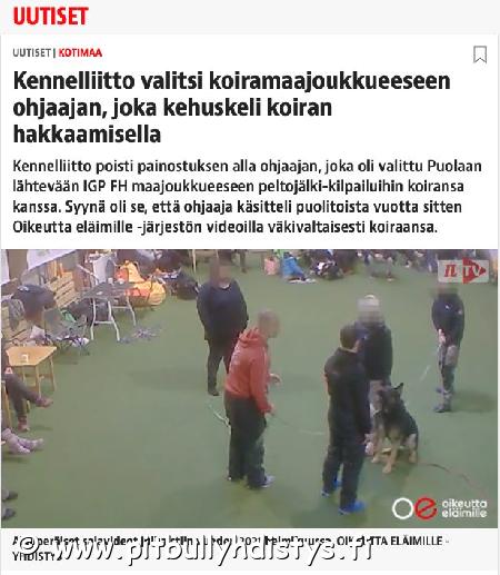 Kennelliitto poisti painostuksen alla ohjaajan, joka oli valittu Puolaan lähtevään IGP FH maajoukkueeseen peltojälki-kilpailuihin koiransa kanssa. Syynä oli se, että ohjaaja käsitteli puolitoista vuotta sitten Oikeutta eläimille -järjestön videoilla väkivaltaisesti koiraansa.