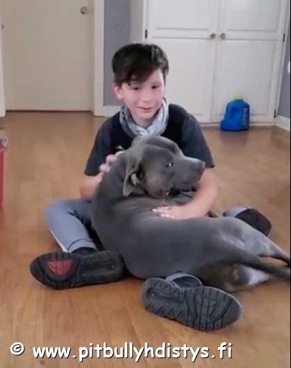 Videolla näkyy Bruiser-pitbulli ja perheen toinen koira yllättämässä kotiin tulevan pojan.